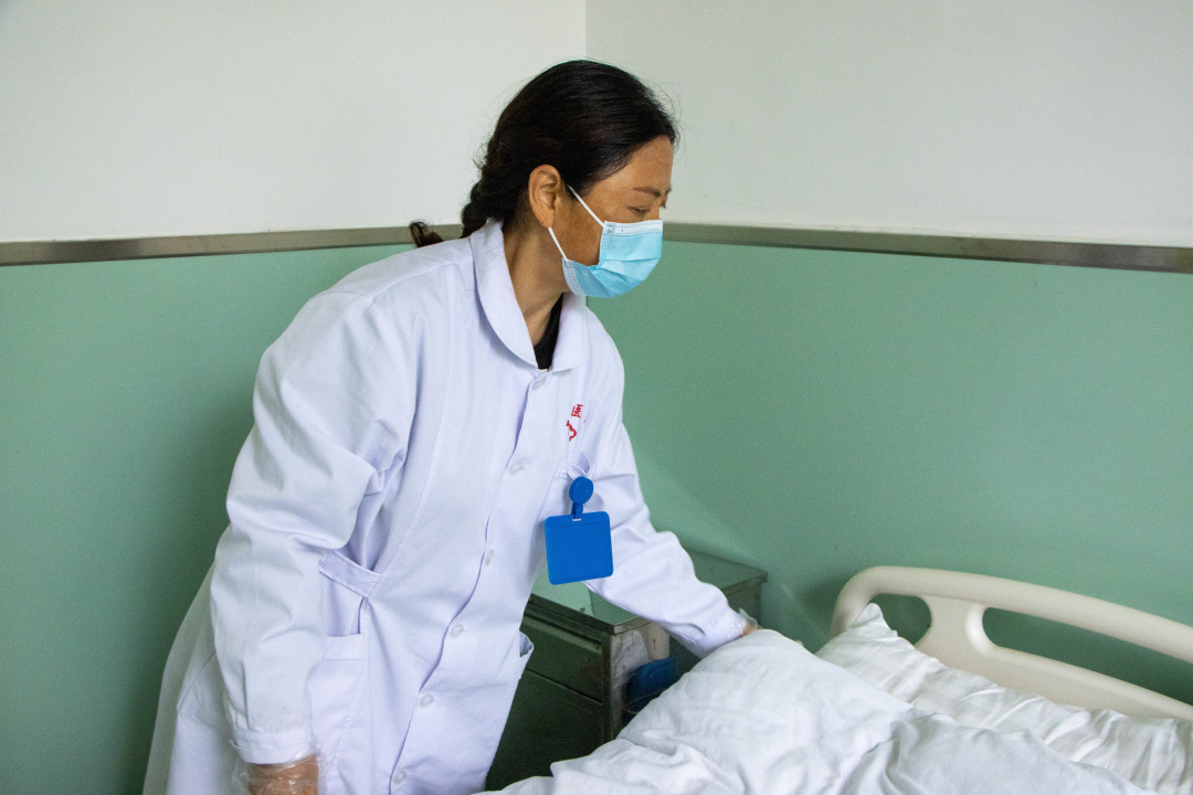 李俊芳护士在整理患者床铺