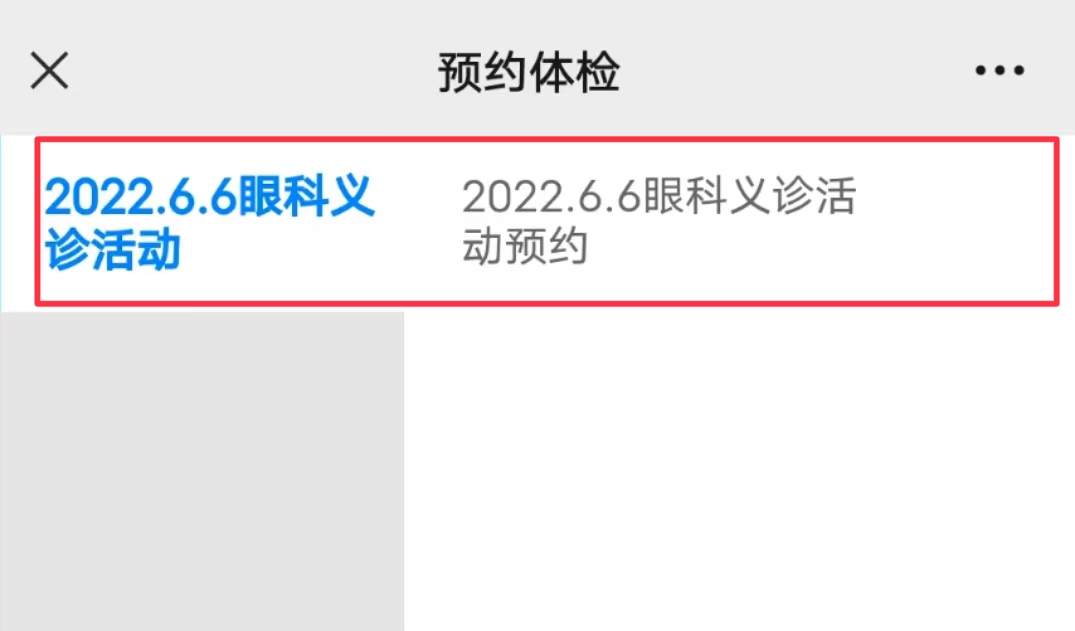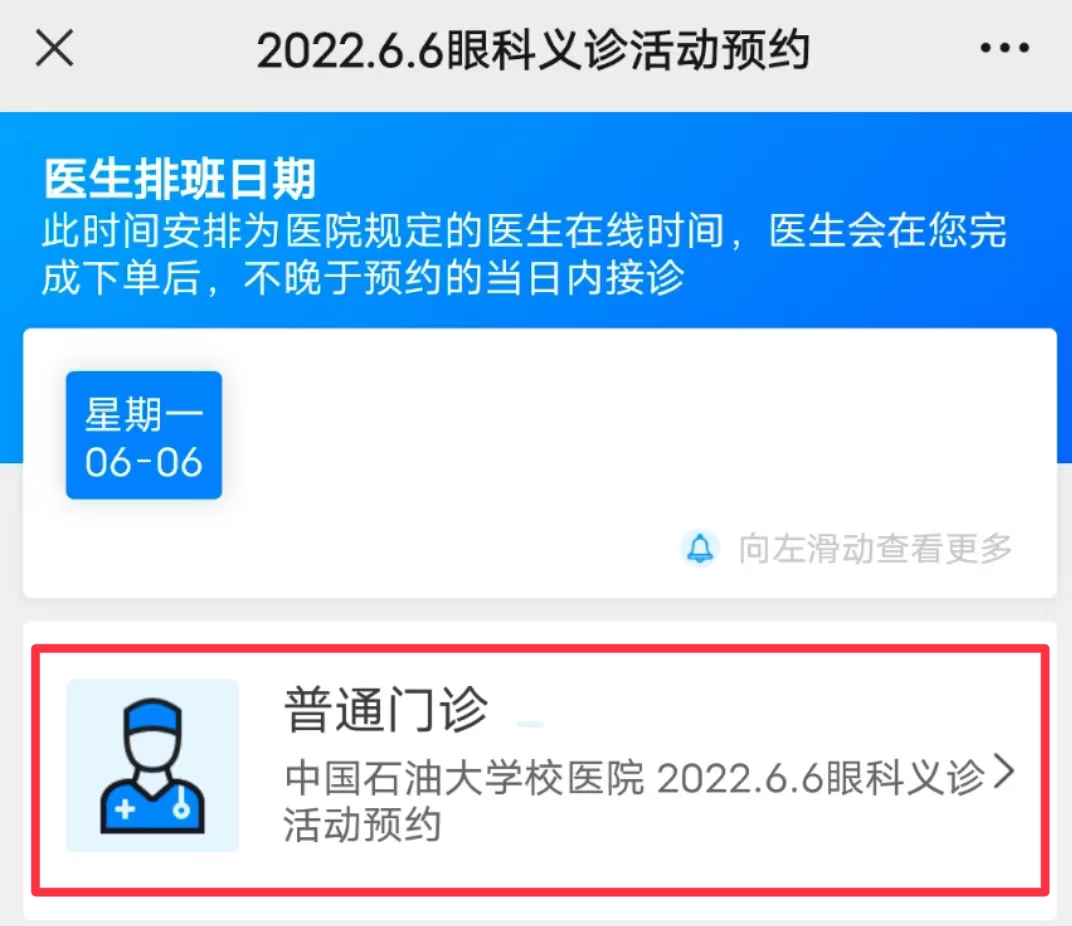 2.点击查体预约→预约体检→眼科义诊活动预约→普通门诊