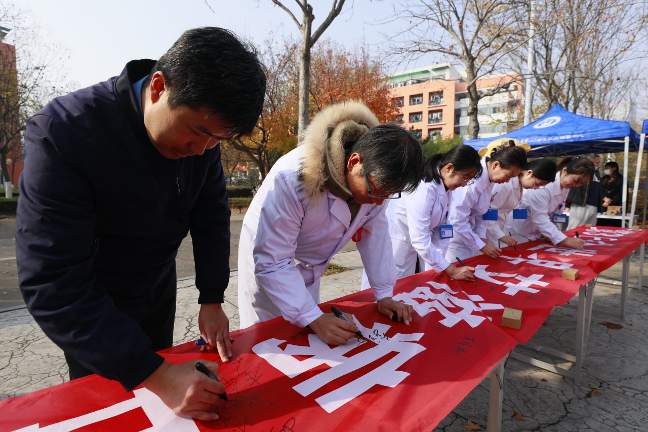 必赢3003no1线路检测中心医护人员在合力共抗艾滋的条幅上签字