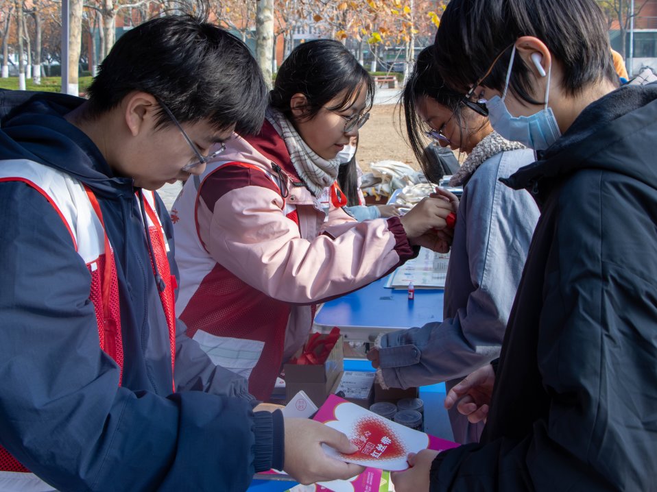 必赢3003no1线路检测中心医护人员准备为学生佩戴红丝带