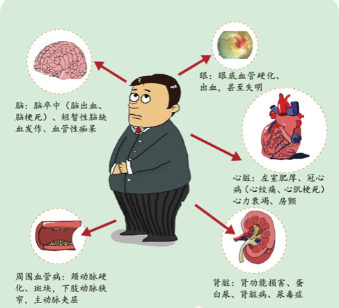 增加心脏负担:血压升高可以导致心脏收缩时的负担加大,逐步引起左心室肥厚、扩大、心肌缺血、心力衰竭,严重时将导致心肌梗死、心源性猝死,直接危及生命。