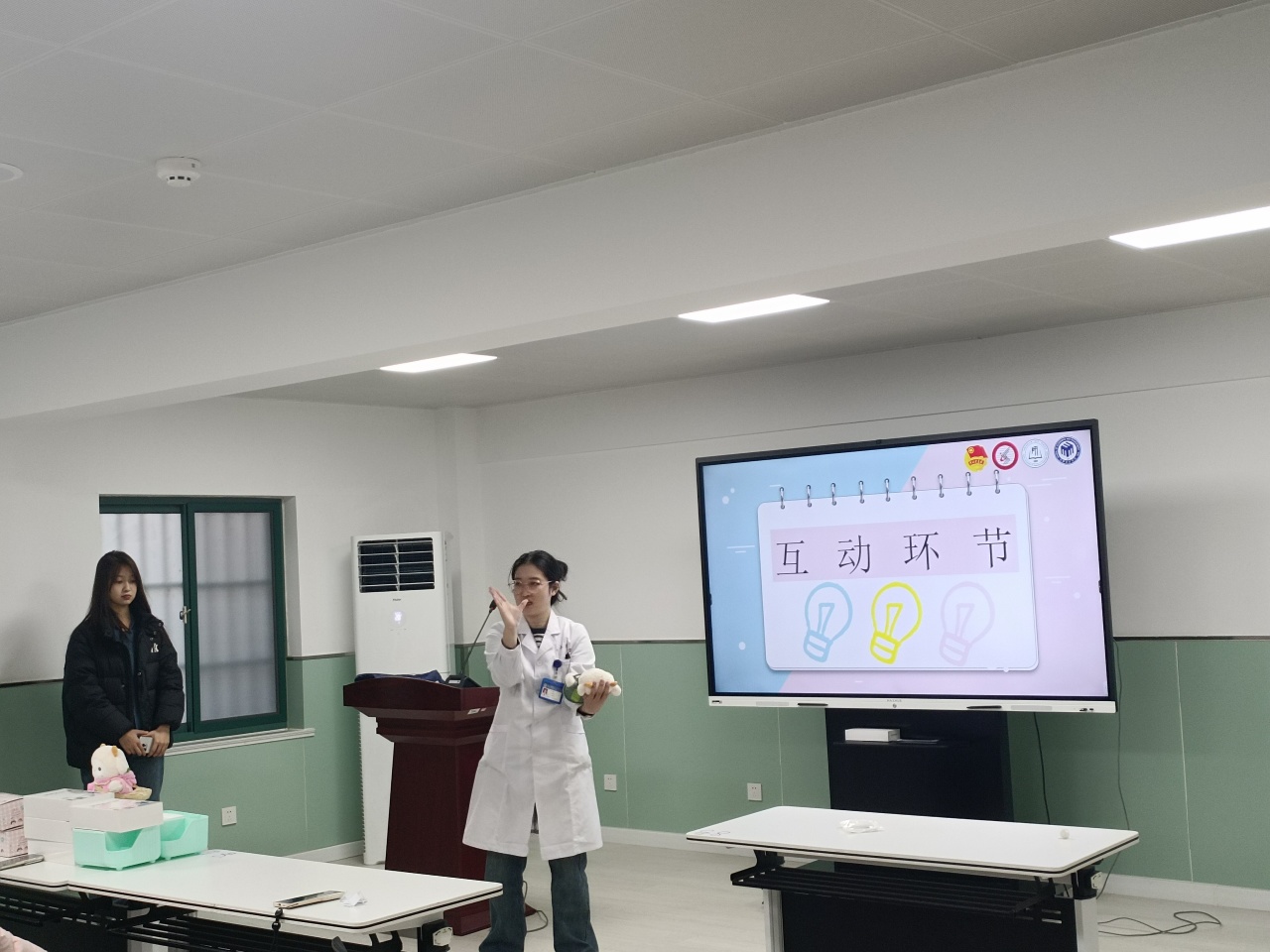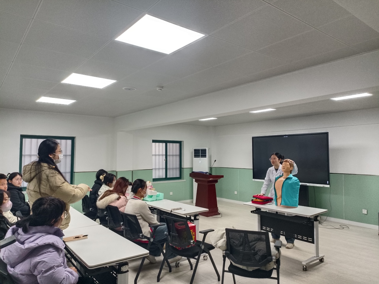 理论知识讲解完毕之后,郑大夫演示了一遍完整的急救过程,并点出注意事项。随后是互动问答环节,针对学生提出的问题,她给予详细解答,活动氛围一度欢快热闹。