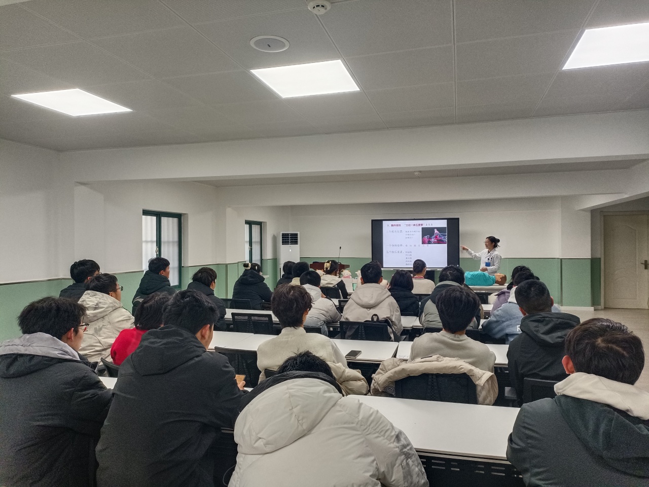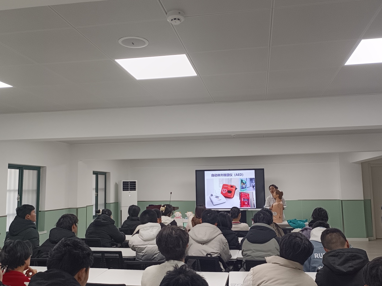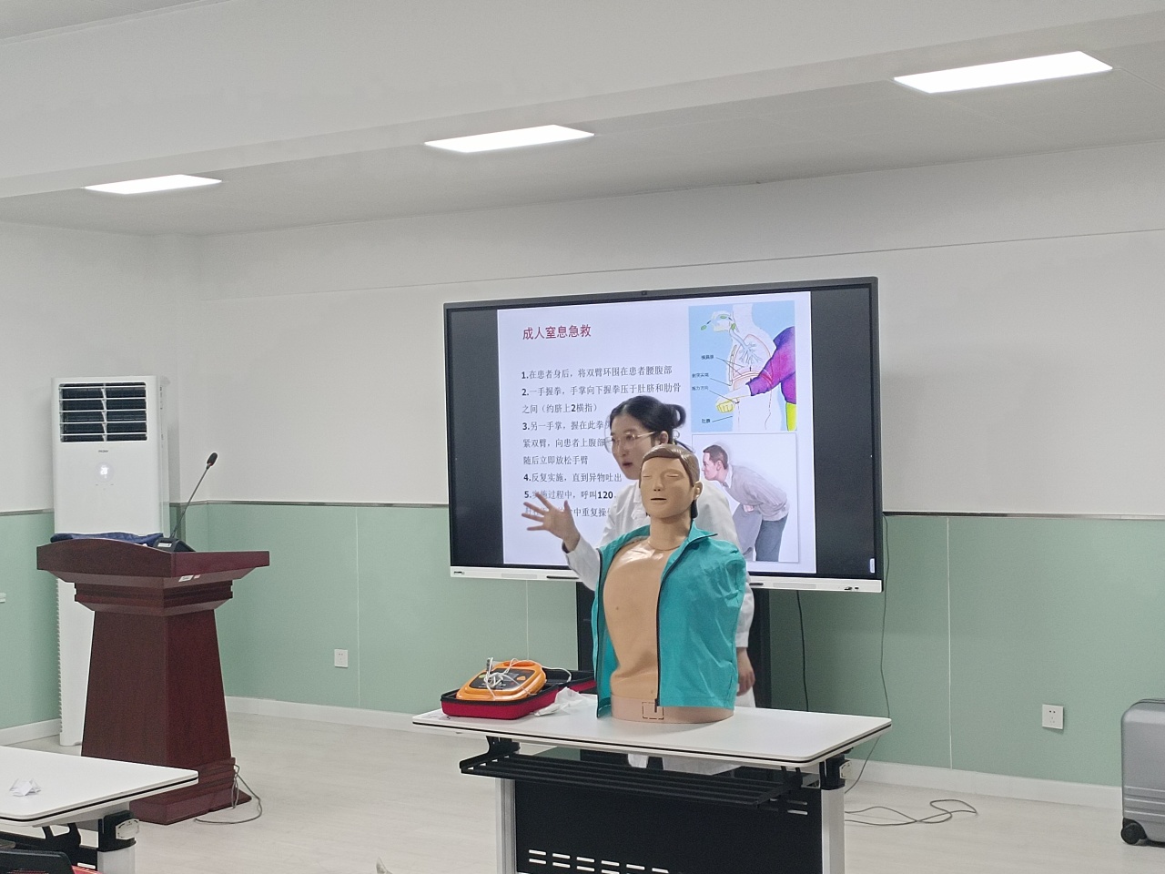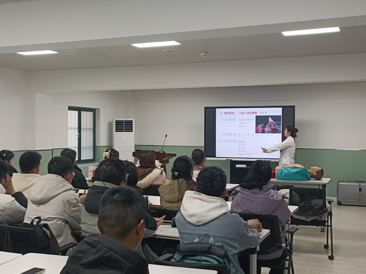 主讲医生郑大夫通过详细的案例讲解和辅助演示,结合自己的临床经历,深入浅出地为学生讲解了了心肺复苏的步骤要领、AED的使用方法和海姆立克急救法。