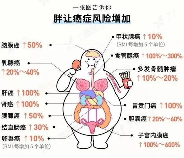 医学研究已经证明,肥胖与多种疾病的发生密切相关,并可能带来较高的早期死亡风险。脂肪组织过多的质量效应或其直接的代谢效应,还与各种慢性病发生相关,包括糖尿病、脑卒中、冠状动脉疾病、高血压、呼吸系统疾病、睡眠呼吸暂停综合征、骨关节炎和胆石症。肥胖甚至还与多种肿瘤的发生相关。此外,肥胖可能给个体带来不良心理和社会后果。