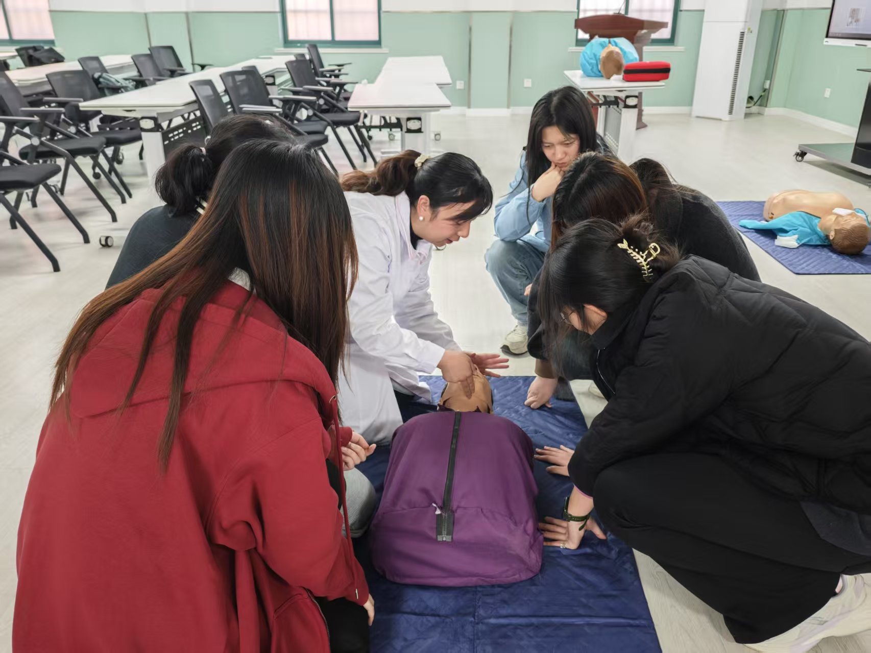 参训学生在讲解结束后组成协作小组,在医务人员细致入微的引领下逐一开展实践演练与成果展示,医务人员严格遵循标准流程对参训学生的动作细节进行精准纠偏,指导实际操作练习。