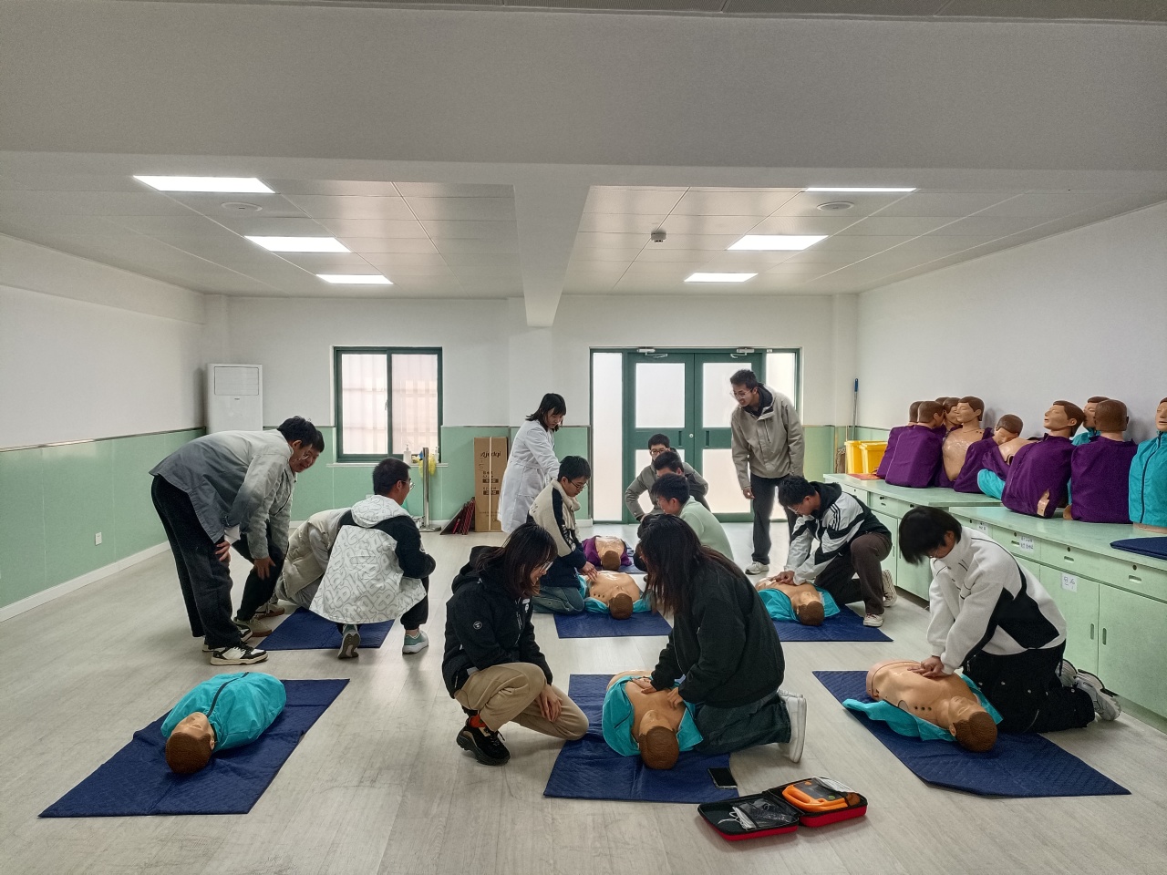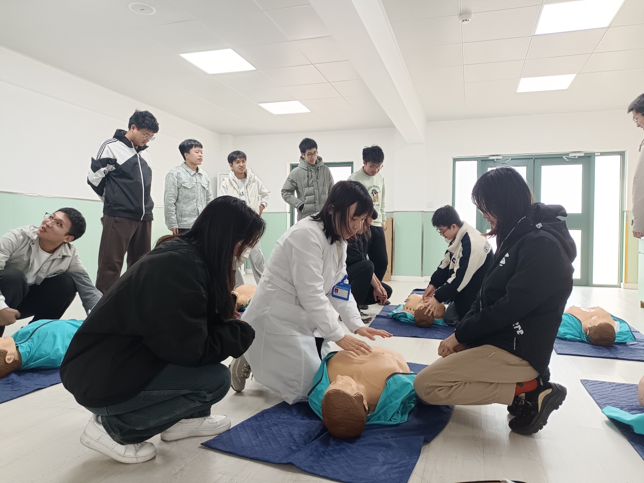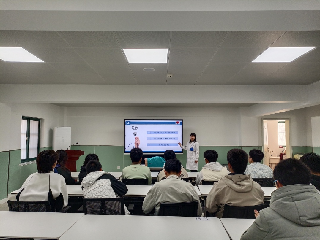 培训的最后是实践操作环节,学生们认真观察医护人员的演示,积极进行模拟操作,医护人员在旁耐心指导,及时纠正不规范动作,确保每位学生都能掌握心肺复苏的核心技巧。