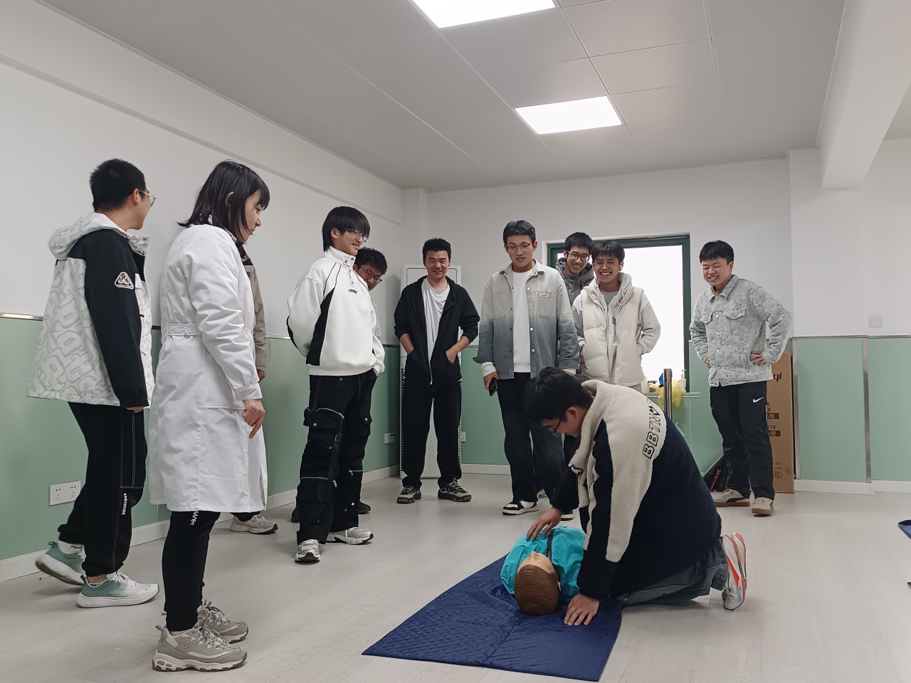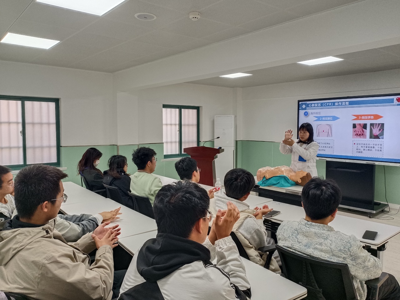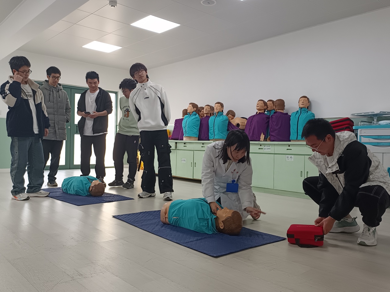 培训的最后是实践操作环节,学生们认真观察医护人员的演示,积极进行模拟操作,医护人员在旁耐心指导,及时纠正不规范动作,确保每位学生都能掌握心肺复苏的核心技巧。